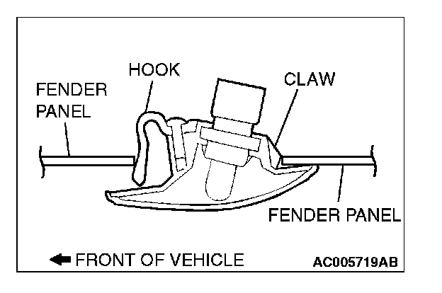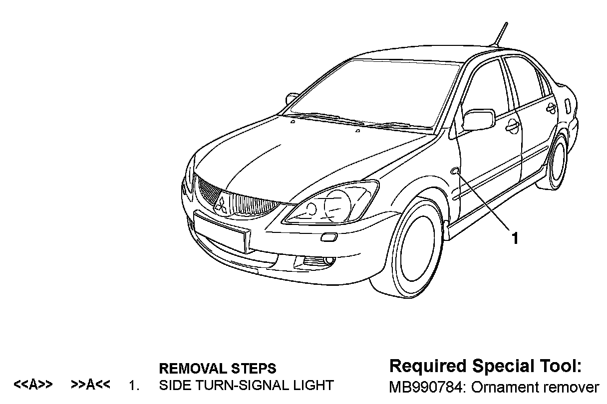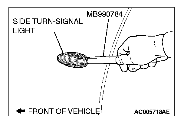 Use special tool MB990784, etc. to press and deflect the hook to vehicle front from fender, and unhook the pawls to remove the side turn-signal light.