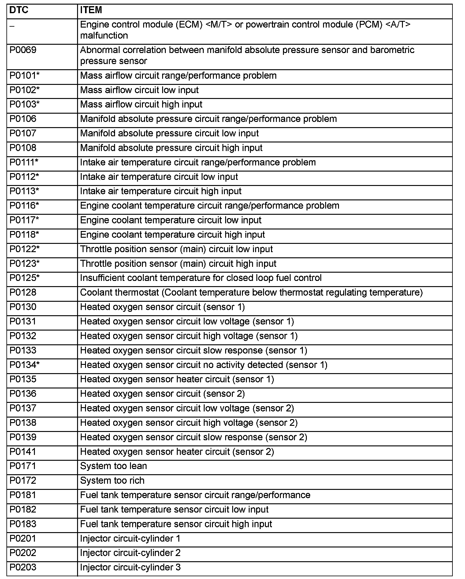 Items Indicated by the Malfunction Indicator Lamp (SERVICE ENGINE SOON or Check Engine Lamp)P0069 - P0203: