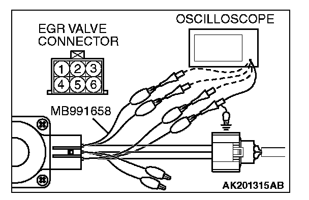 2. Connect the oscilloscope probe to the EGR valve connector terminal No. 1, terminal No. 3, terminal No. 4, No. terminal 6 respectively.