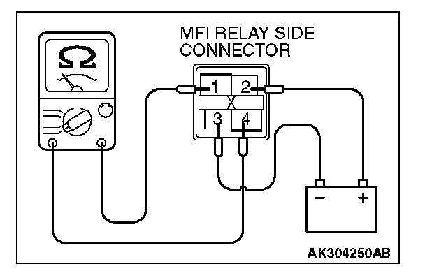 4. Check for continuity between the MFI relay terminal No.1 and No.4 while connecting and disconnecting the jumper wire at the negative battery terminal.