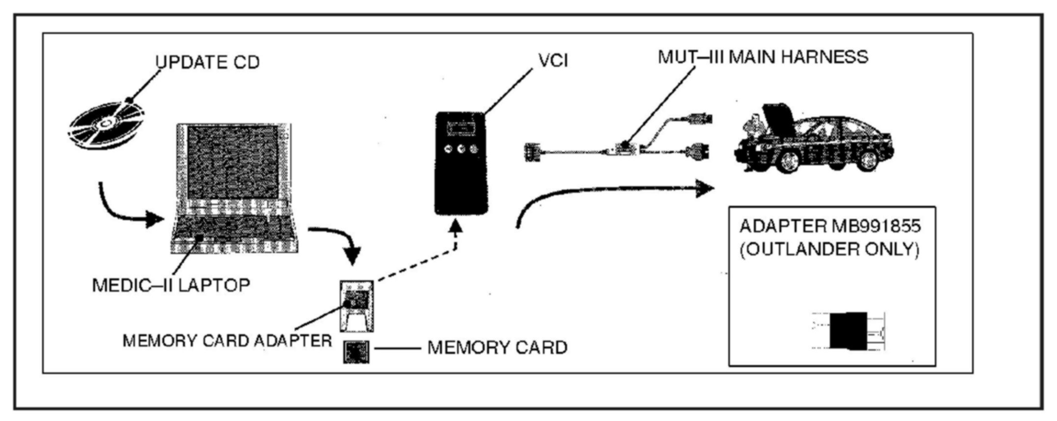a. STV ONLY. If you just transferred the new reprogramming data from the Reflash Update CD 8/06 to the MUT-III hard drive, now transfer the reprogramming data from the MUT-III laptop to the memory card. (Use the port on the left side of the MUT-III laptop.) Select ECU Reprogramming, then Memory Card Transfer. A status bar will display while the data is loading into the memory card.