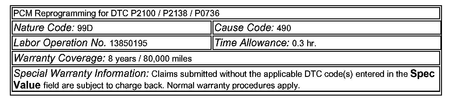 On some affected vehicles, incorrect software parameters in the PCM may cause the MIL to illuminate and Diagnostic Trouble Code P2100 (Throttle Actuator Control Motor Circuit), P2138 (Accelerator Pedal Position Sensor (main and sub) Range/Performance Problem) or P0736 Reverse Gear