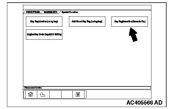 ENCRYPTED CODE REGISTRATION USING BARCODE NO.When the ignition key that starts the engine is replaced due to the replacement of the ignition key set, the ignition key cylinder, etc., the barcode No. must be used to register encrypted codes.
