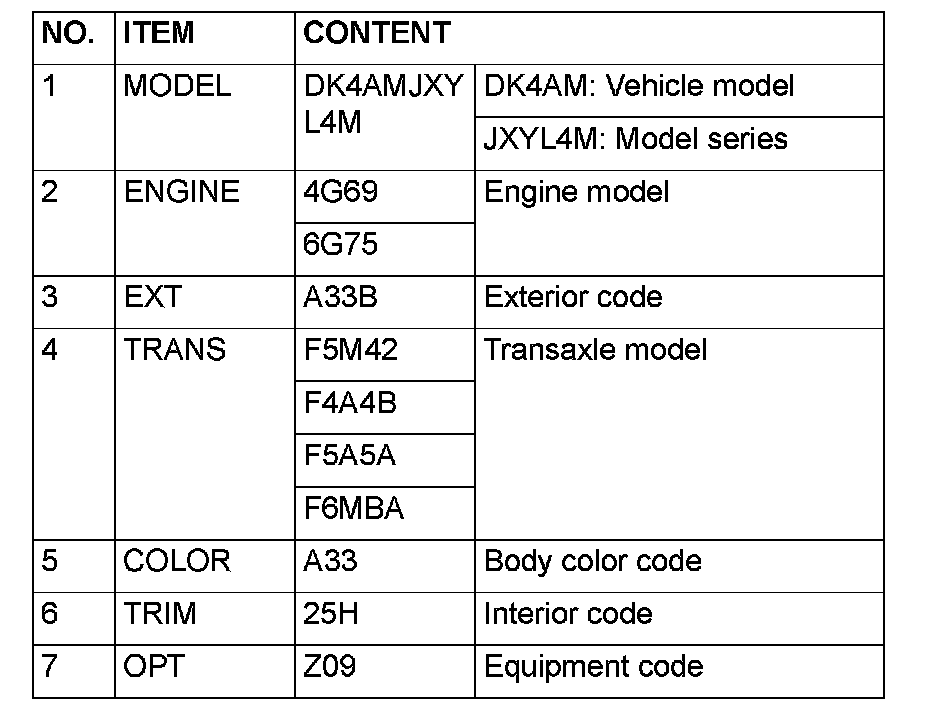 Engine cylinder block, Transaxle housing, Fender, Doors, Liftgate, Side outer panel, Hood, Bumpers, Front end structure bar In addition, a theft-protection label is attached to replacement parts for the body outer panel main components, and the same data is stamped into replacement parts for the engine and the transaxle.
