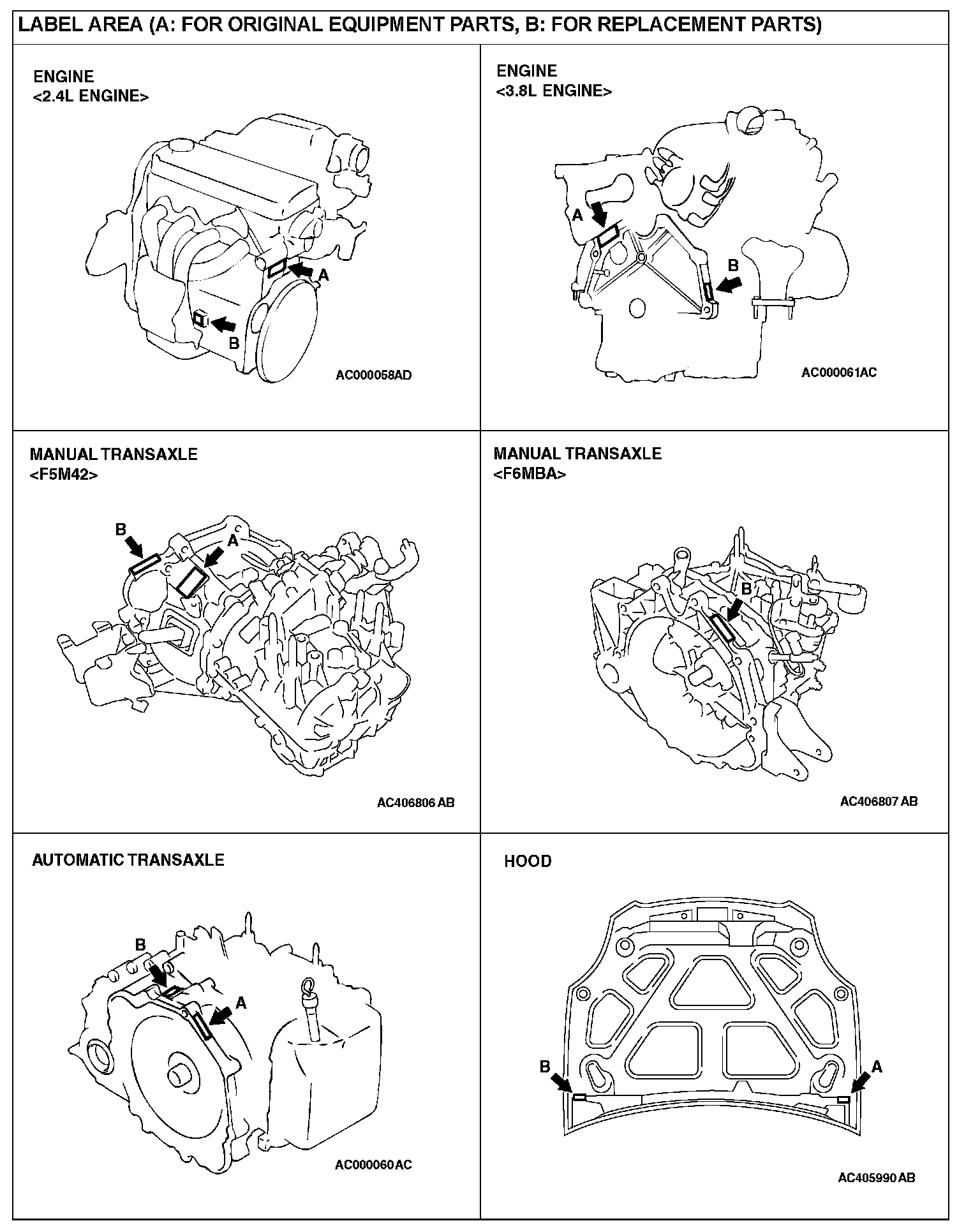 In order to protect against theft, a Vehicle Identification Number (VIN) is attached as a plate or label to the following major parts of the engine and transaxle, as well as main outer panels: