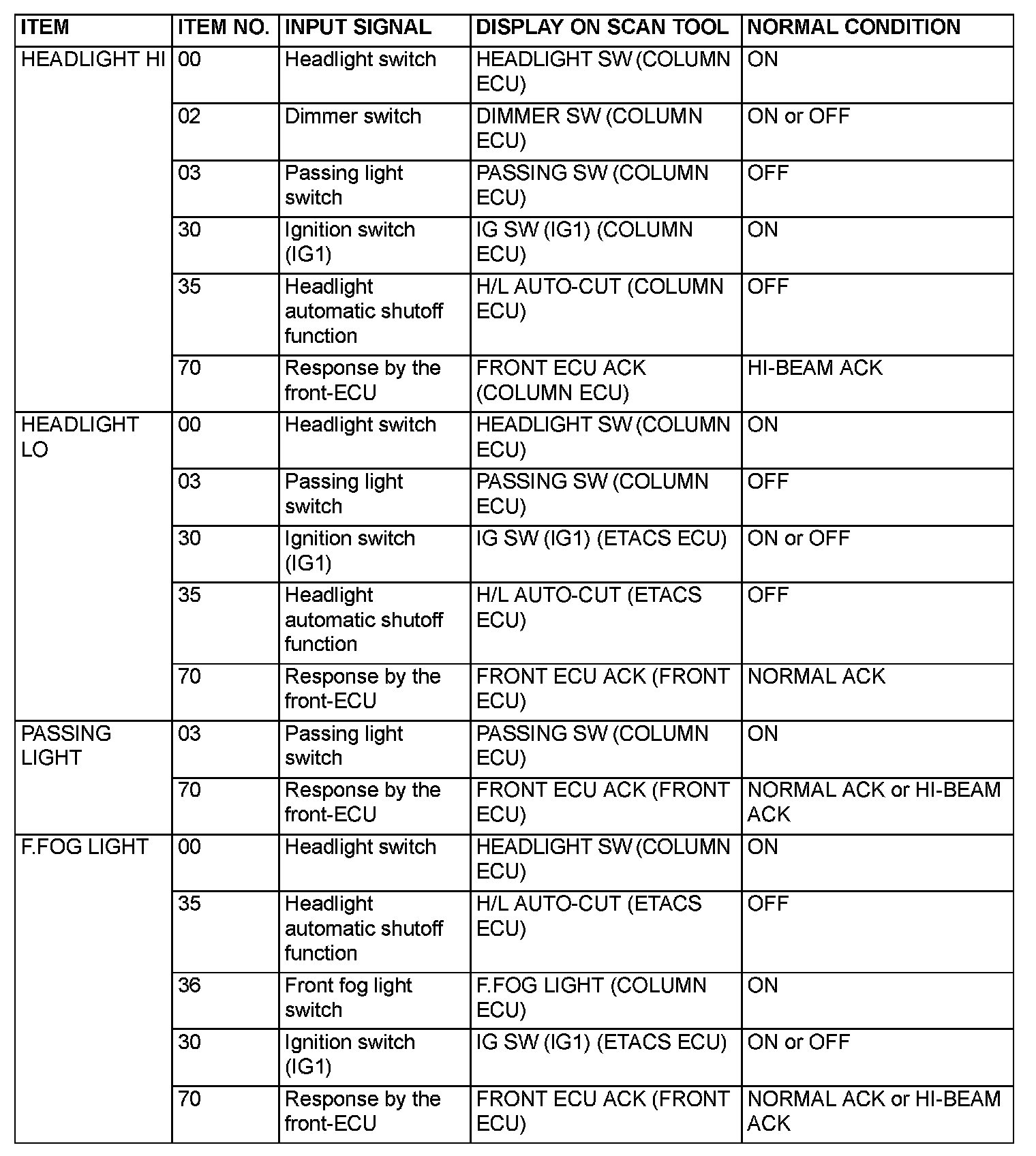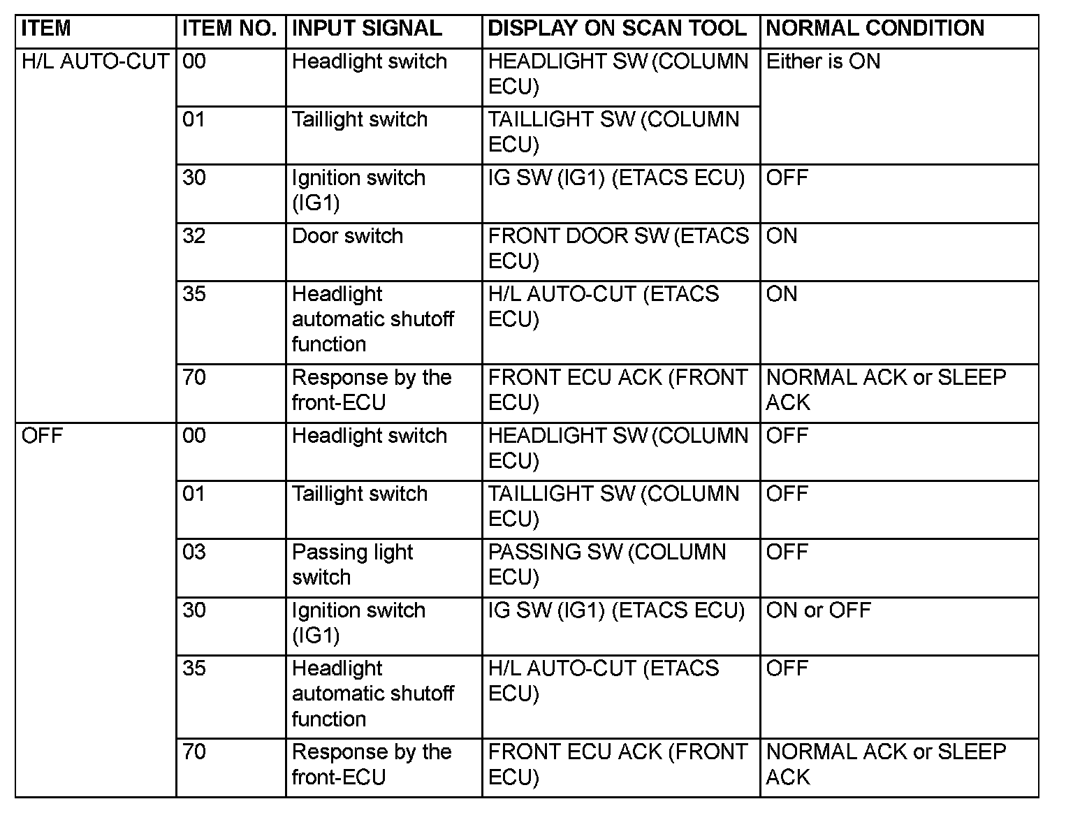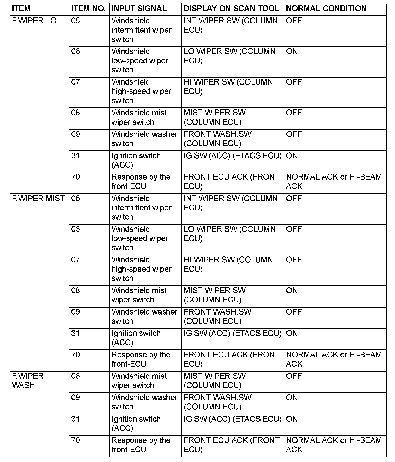 1. The following input signals can be checked by using the scan tool MB991958 (MUT-III Sub Assembly) and the SWS monitor kit.