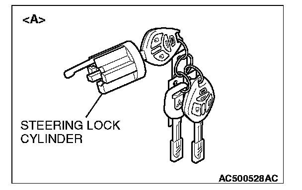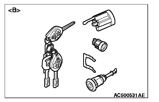 - When adding the ignition key separately, or replacing the components by the steering lock cylinder of illustration [A] (the ignition key is simultaneously supplied) or the key set of illustration [B], register the encrypted code. Refer to Encrypted Code Registration Criteria Table in Antitheft and Alarm Systems.