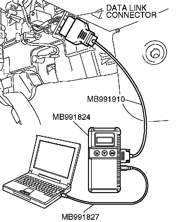 CAUTION: To prevent damage to scan tool MB991958, always turn the ignition switch to the "LOCK" (OFF) position before connecting or disconnecting scan tool MB991958.