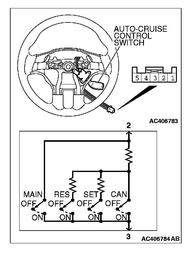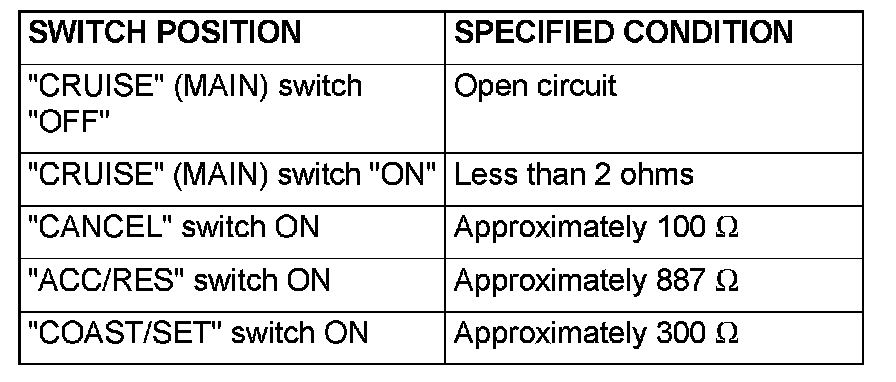 2. Measure the resistance between terminal 2 and terminal 3 when each of the "COAST/SET", "ACC/RES", "CANCEL" and "CRUISE" (MAIN) switches is pressed. If values measured at the time each switch is pressed correspond to those in the table below, the resistance values are correct.
