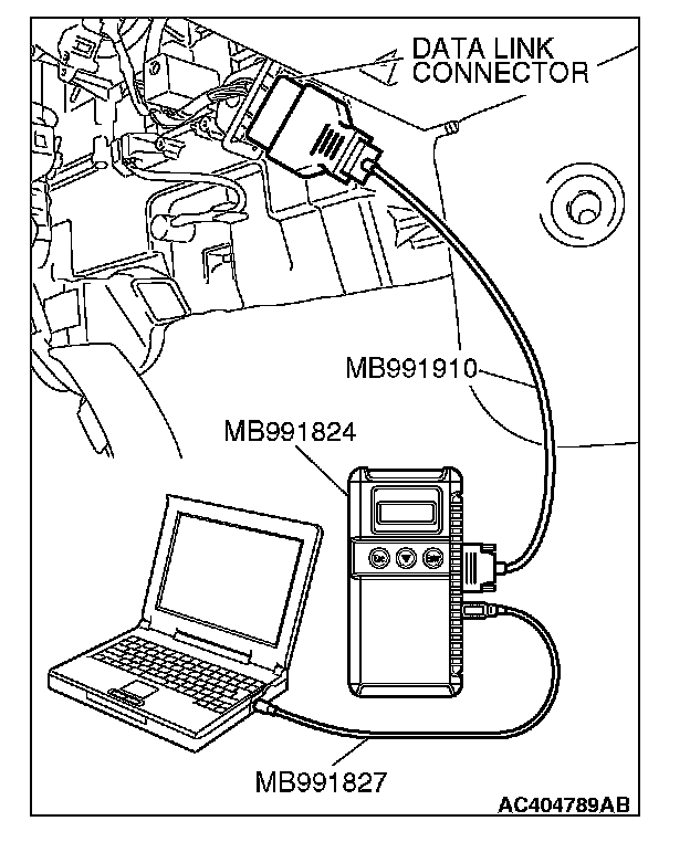 CAUTION: To prevent damage to scan tool MB991958, always turn the ignition switch to the "LOCK" (OFF) position before connecting or disconnecting scan tool MB991958.