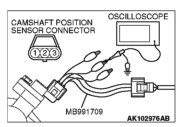 1. Disconnect the camshaft position sensor connector, and connect the test harness special tool (MB991709) between the separated connector (All terminals should be connected).