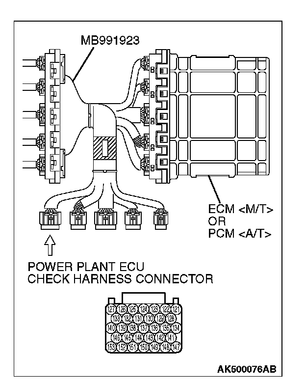 1. Disconnect the EGR valve connector, and connect the test harness special tool (MB991658) between the separated connector (All terminals should be connected).