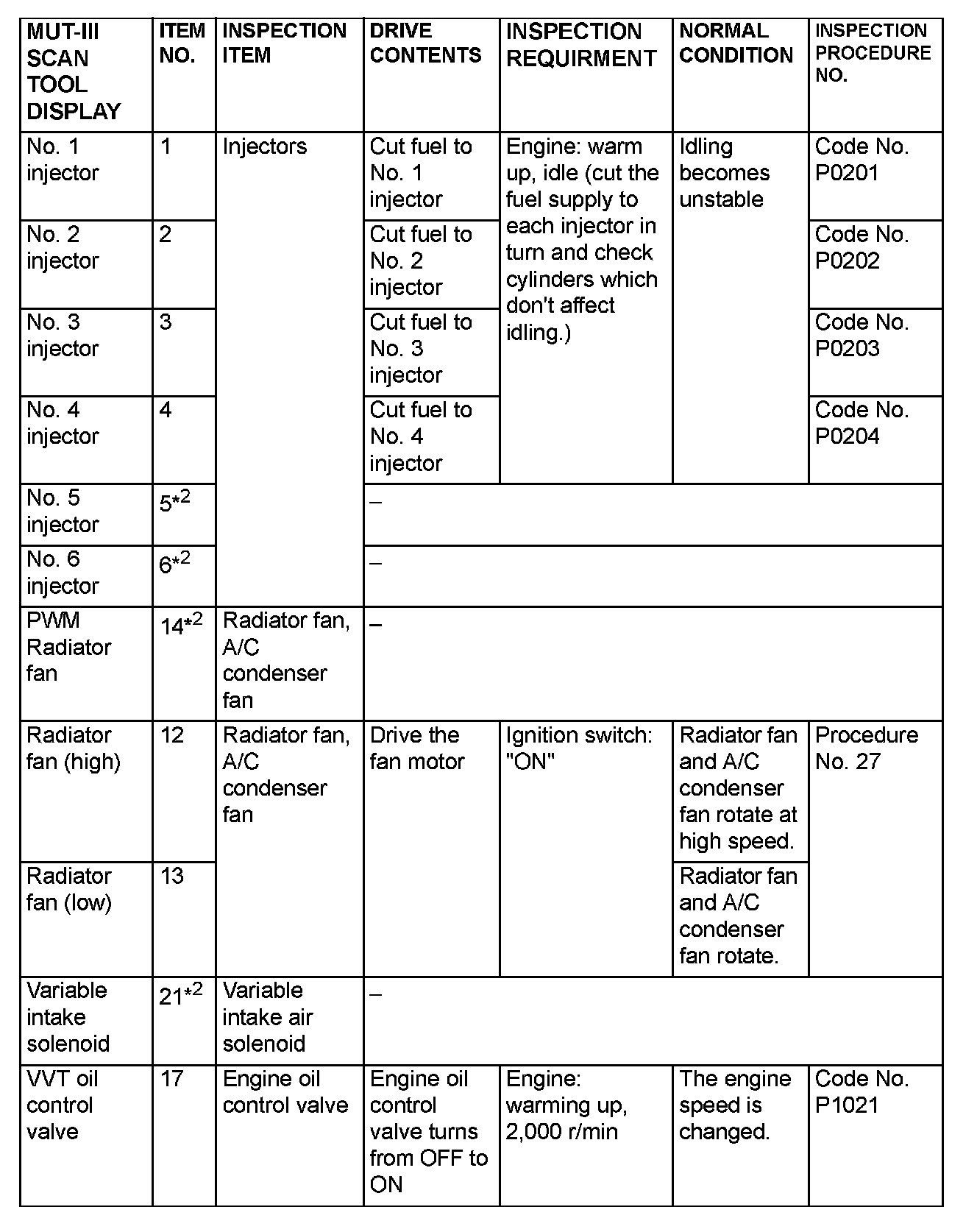 Actuator Test Reference Table