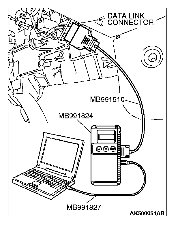 CAUTION: To prevent damage to scan tool MB991958, always turn the ignition switch to the "LOCK" (OFF) position before connecting or disconnecting scan tool MB991958.