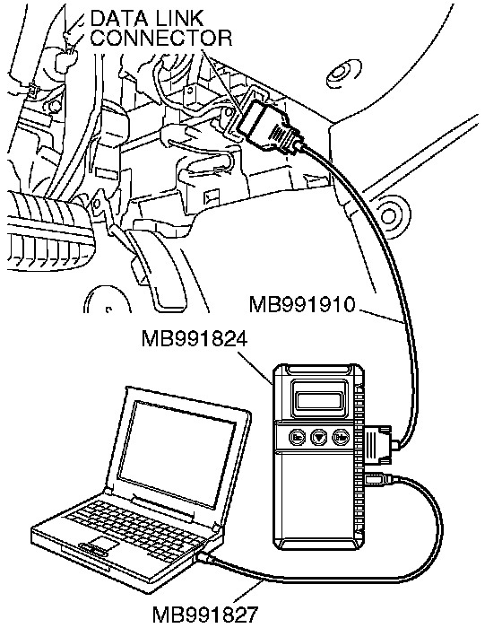 CAUTION: To prevent damage to scan tool MB991958, always turn the ignition switch to the "LOCK" (OFF) position before connecting or disconnecting scan tool MB991958.