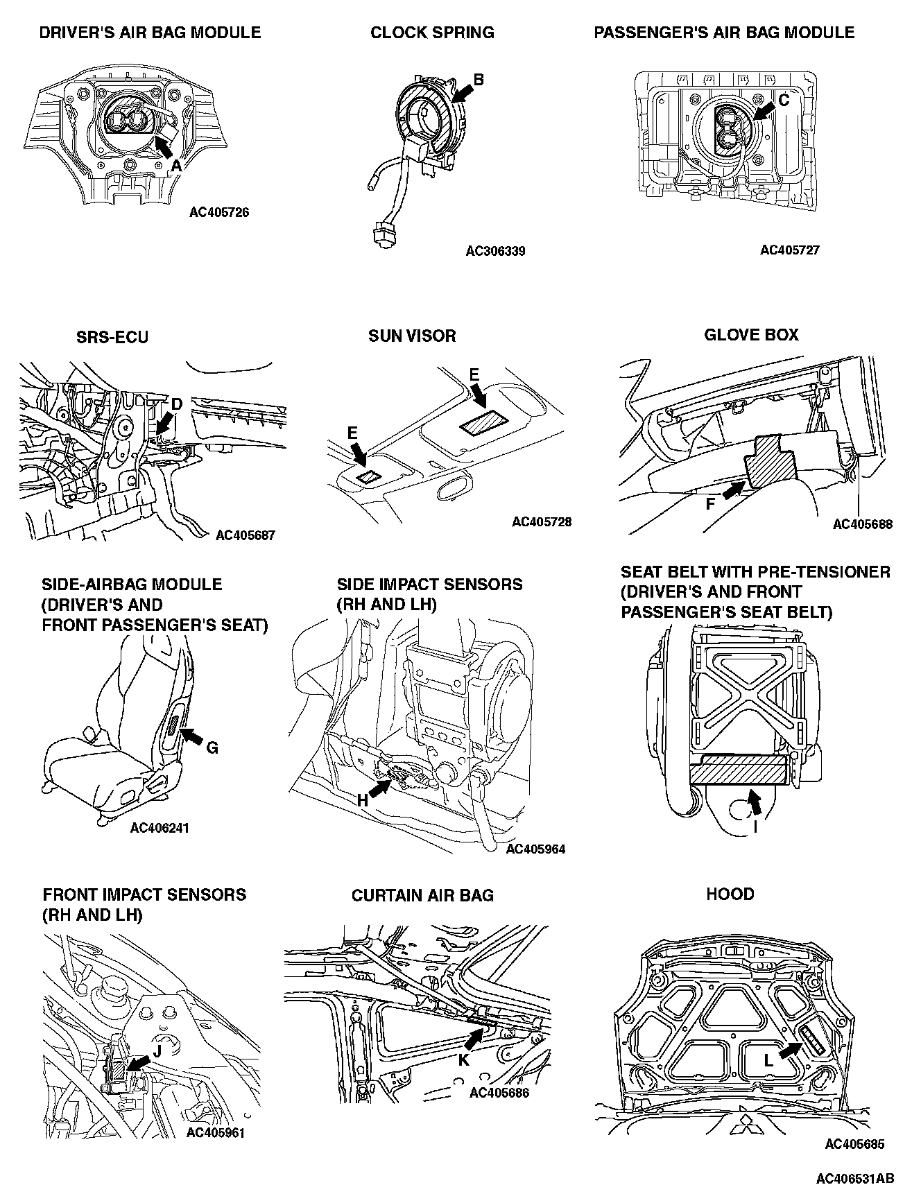 A number of caution labels related to the SRS are found in the vehicle, as shown in the given illustrations. Follow label instructions when servicing SRS. If the labels are dirty or damaged, replace them.