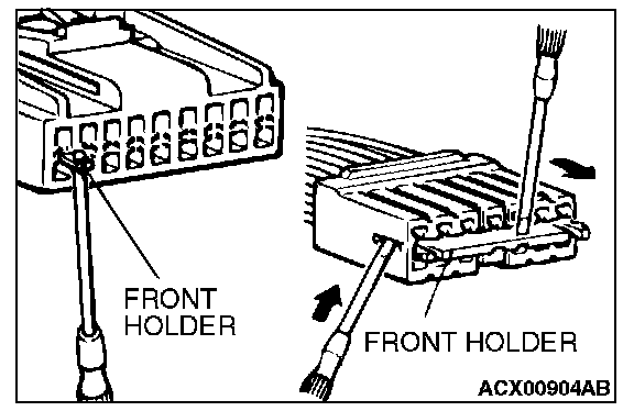 1. Insert a screwdriver [1.4 mm (0.06 inch) width] as shown in the figure, disengage the front holder, and remove it.