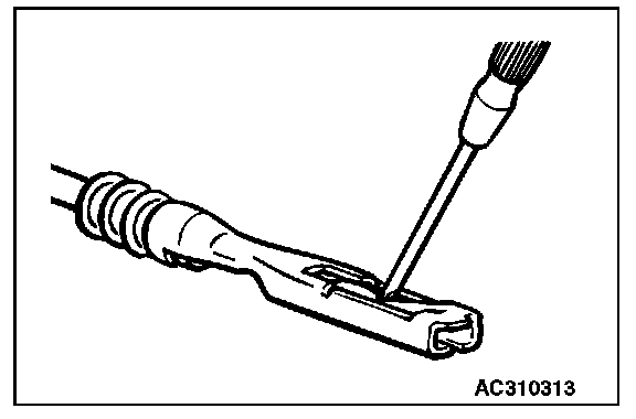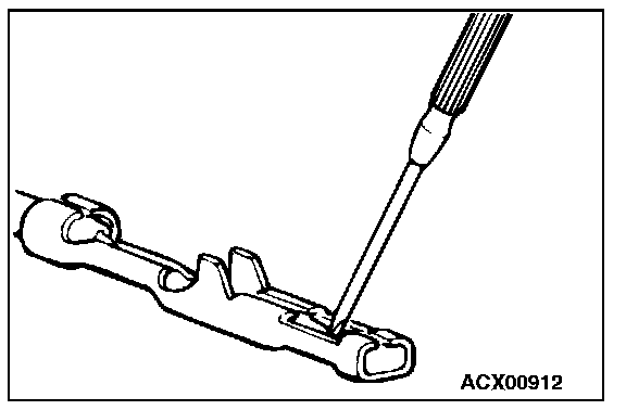 2. Insert the tip of a screwdriver [0.8 mm (0.03 inch) width] into the connector as shown in the figure, push it lightly to raise the housing lance, and pull out the terminal.