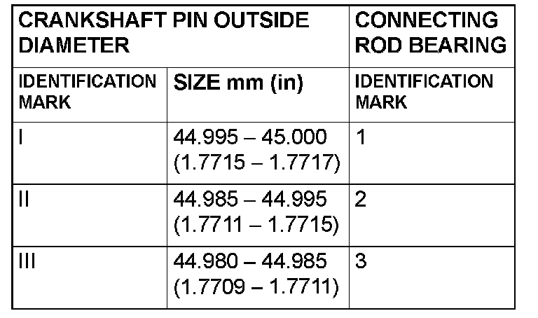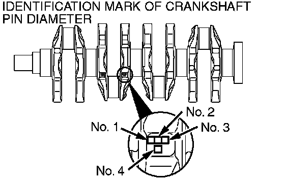 Connecting Rod BearingMeasure the crankshaft pin diameter and confirm its classification from the following table. On a crankshaft supplied as a service part, identification marks of its pins are stamped at the positions shown in the illustration.