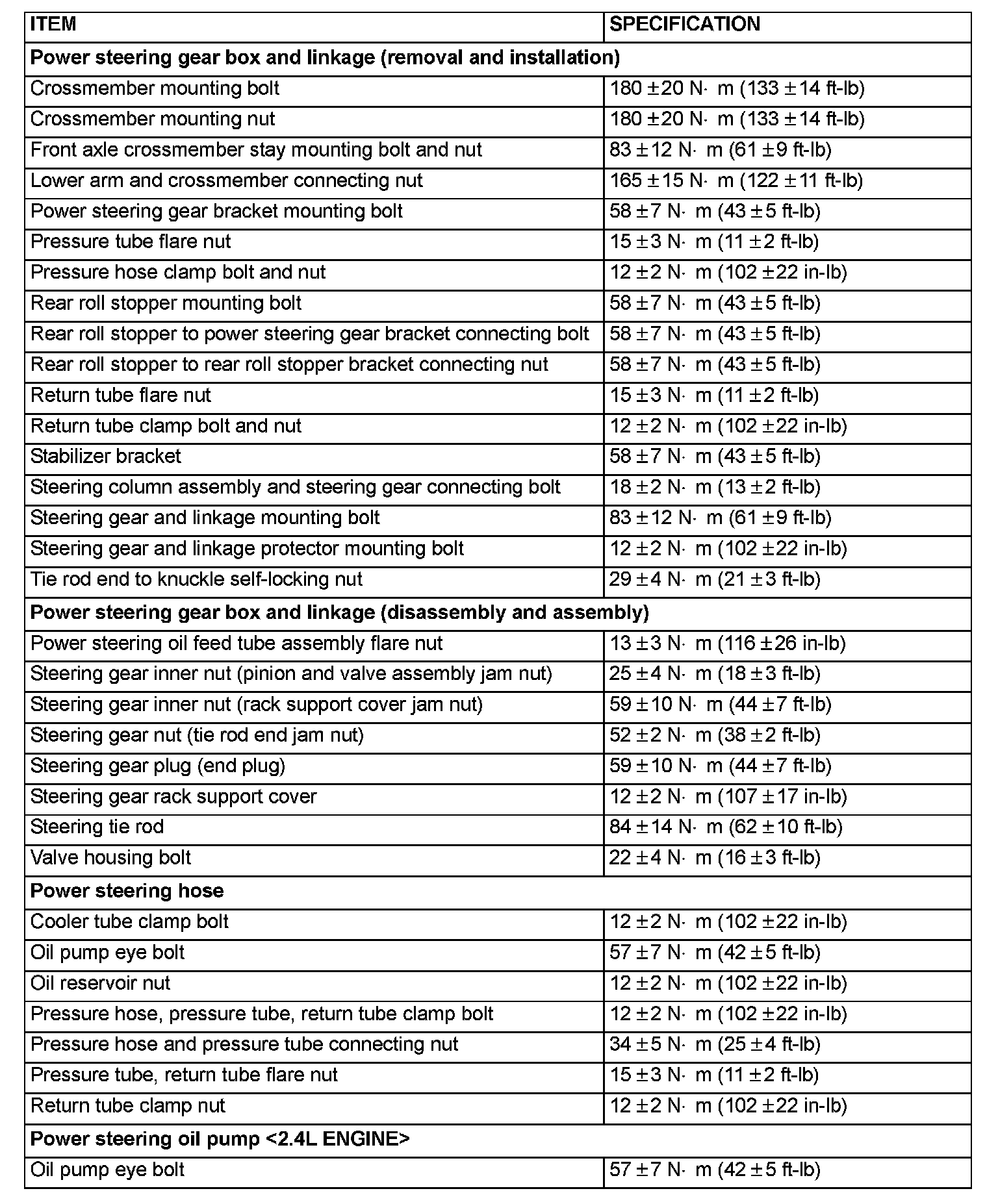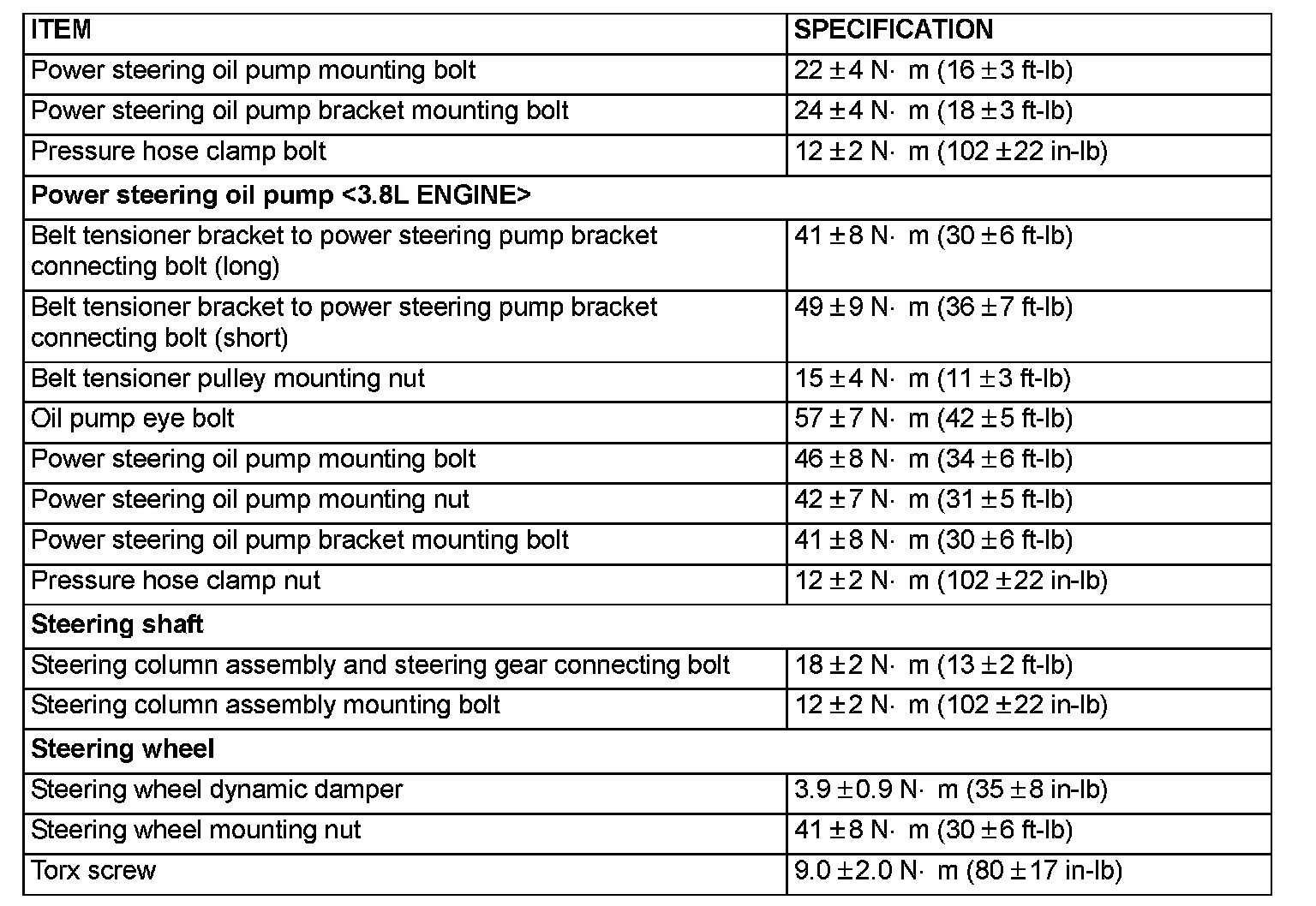 FASTENER TIGHTENING SPECIFICATIONS: