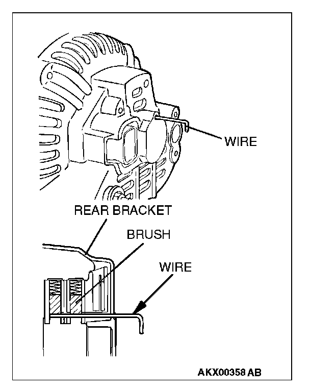 After installing the regulator assembly, insert a wire through the hole provided on the rear bracket while pressing down on the brush, and secure the brush.