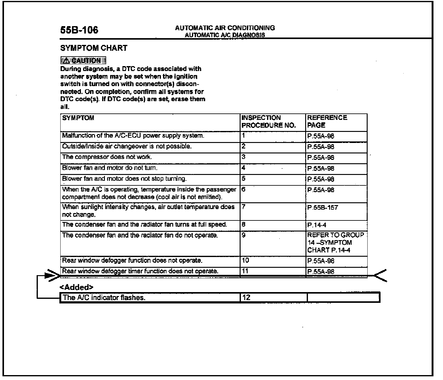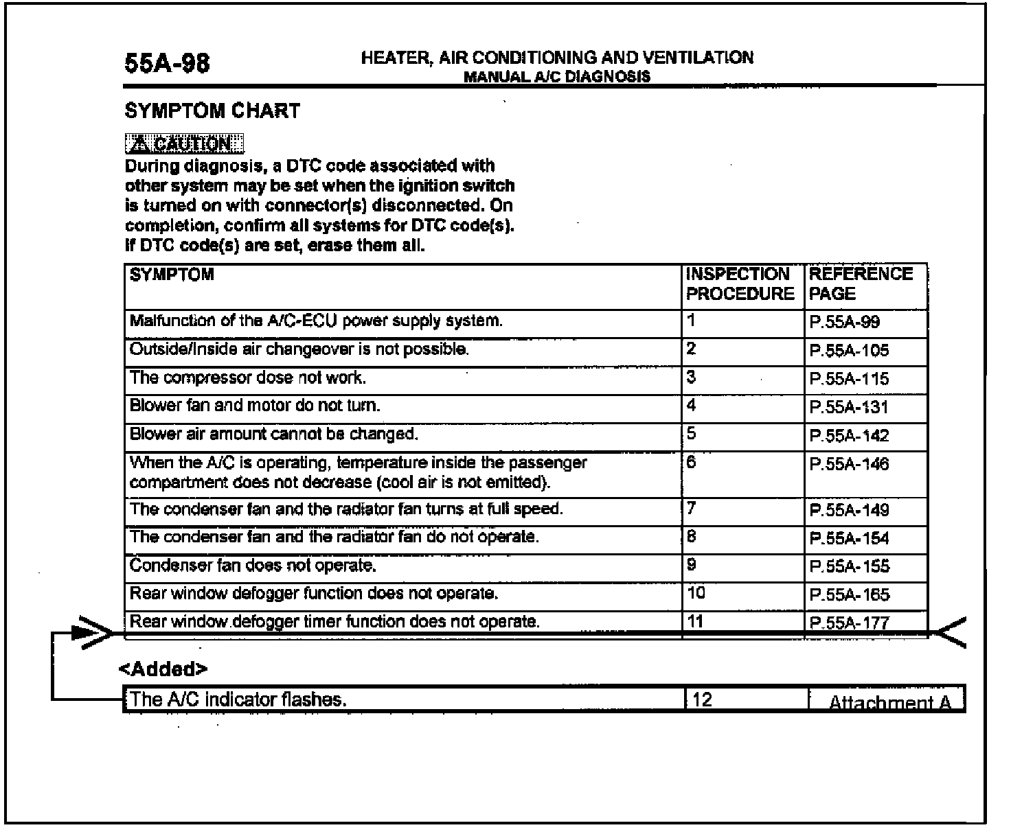 Diagnosis procedures for a flashing A/C indicator light are missing in the affected service manuals. This bulletin contains these diagnosis procedures (Inspection Procedure 12) for manual and automatic A/C systems.
