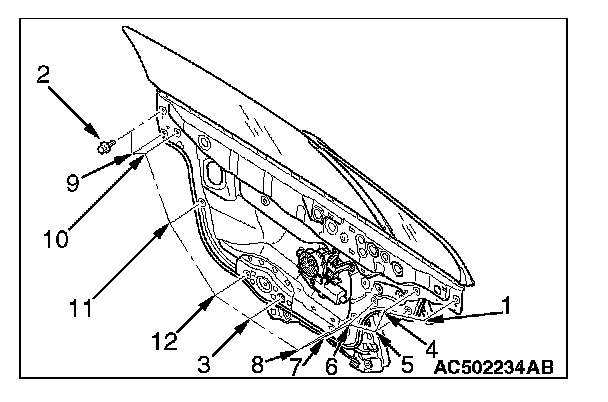 CAUTION: When loosening the door window glass mounting bolts, use a magnetic wrench to prevent bolts from dropping into the door window module assembly cavity.