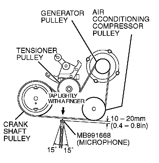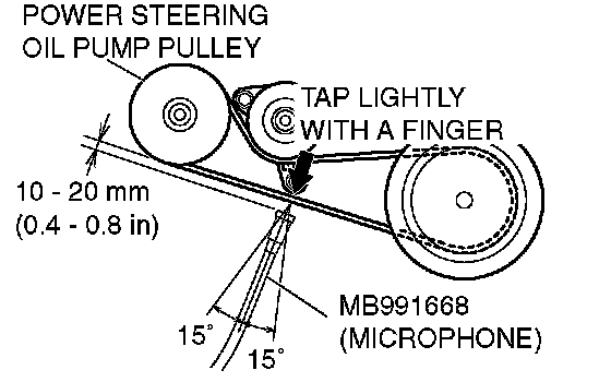 5. Hold special tool MB991668 (microphone) to the middle of the drive belt between the pulleys (at the place indicated by the arrow), about 10 - 20 mm (0.4 - 0.8 inch) away from the rear surface of the belt and so that it is perpendicular to the belt (within an angle of ± 15 degree angle).