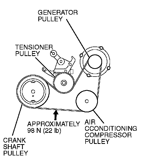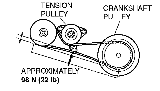 Apply approximately 98 N (22 pounds) of force to the middle of the drive belt between the pulleys (at the place indicated by the arrow) and check that the amount of deflection in within the standard value.