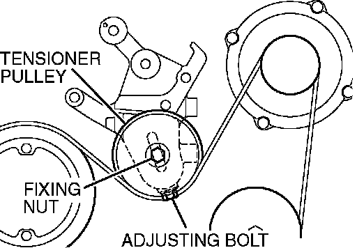 2. With the tensioner pulley fixing nut temporarily tightened to 15 ± 5 Nm (11 ± 4 ft. lbs.), set the belt tension or deflection to the standard value using the adjusting bolt.