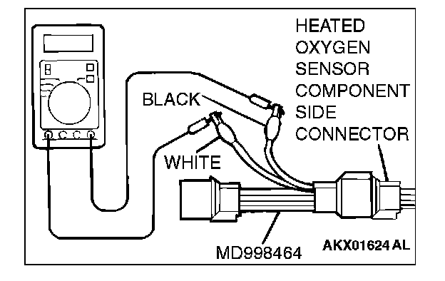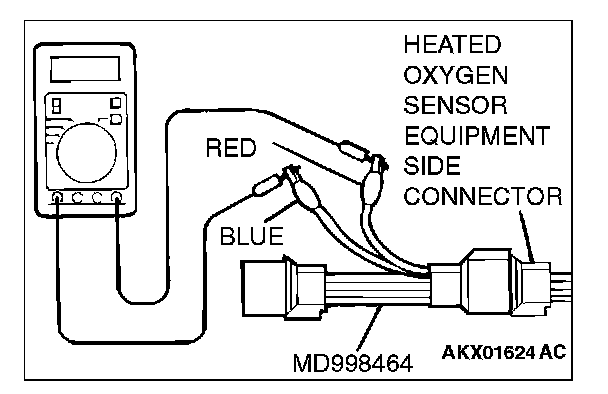 1. Disconnect the heated oxygen sensor connector and connect special tool MD998464 to the connector on the heated oxygen sensor side.