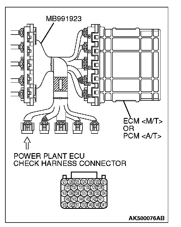 1. Disconnect the intermediate connector B-32, and connect the test harness special tool (MB991658) between the separated connector.