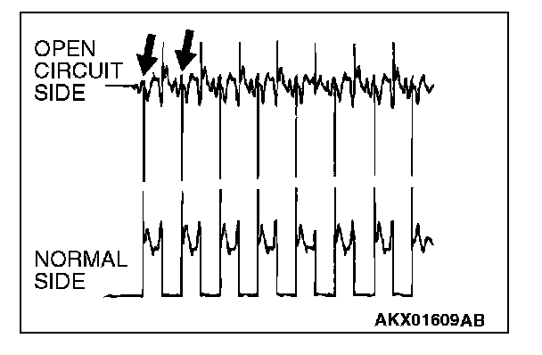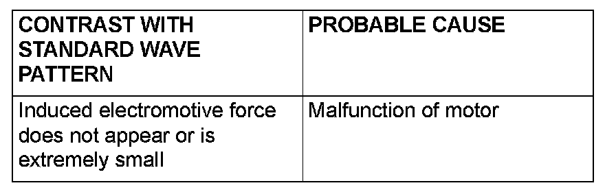 - Current is not supplied to the motor coil on the open circuit side. (Voltage does not drop to 0 volt.) Furthermore, the induced electromotive force wave pattern at the normal side is slightly different from the normal wave pattern.
