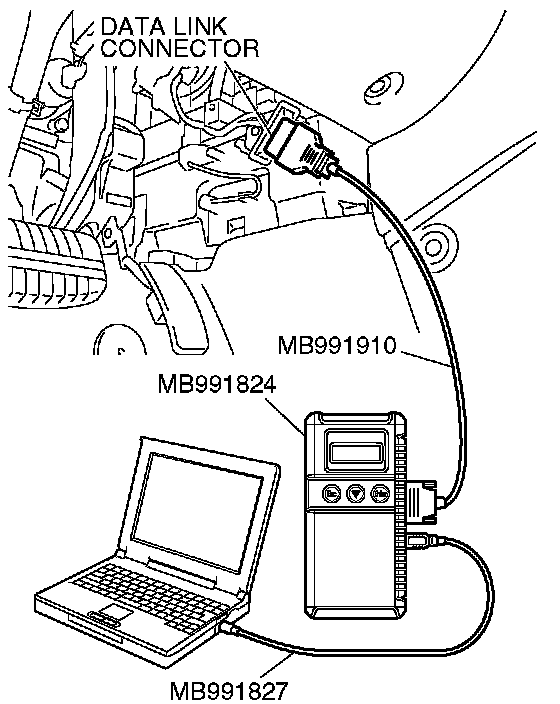 CAUTION: To prevent damage to scan tool MB991958, always turn the ignition switch to the "LOCK" (OFF) position before connecting or disconnecting scan tool MB991958.