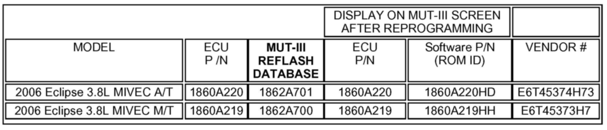2. Using the MUT-III, verify that the vehicle's ECU part number is listed in the table in Step 7.