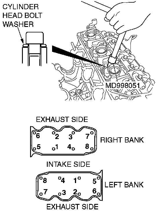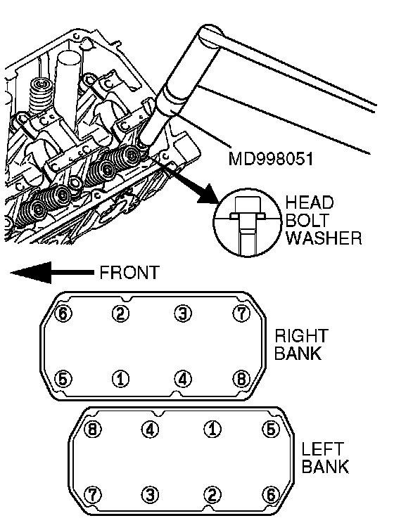 Using special tool MD998051 and a torque wrench, tighten the bolts to the specified torque in the order shown in the illustration. (in two or three cycles)