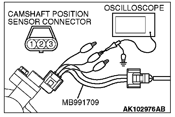 1. Disconnect the camshaft position sensor connector, and connect the test harness special tool (MB991709) between the separated connector (All terminals should be connected).