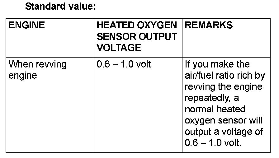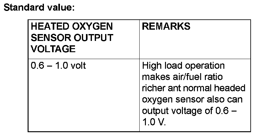 NOTE: If the sufficiently high temperature [of approximate 400 degrees C (752 degrees F) or more] is not reached although the heated oxygen sensor is normal, the output voltage would be possibly low although the rich air/fuel ratio.