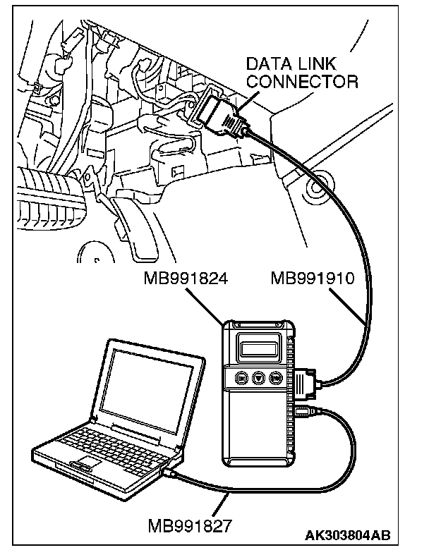 CAUTION: To prevent damage to scan tool MB991958, always turn the ignition switch to the "LOCK" (OFF) position before connecting or disconnecting scan tool MB991958.
