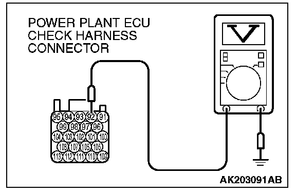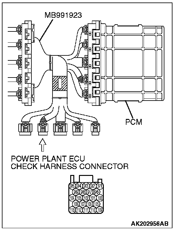 1. Disconnect all PCM connectors. Connect the power plant ECU check harness special tool MB991923 between the separated connectors.
