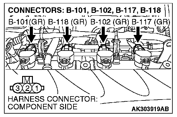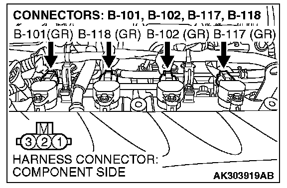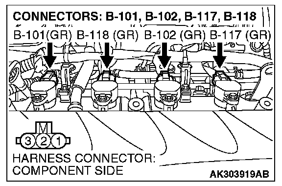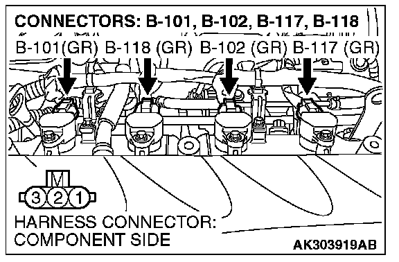 STEP 5. Check the circuit at ignition coil harness side connector B-101, B-102, B-117 and B-118.