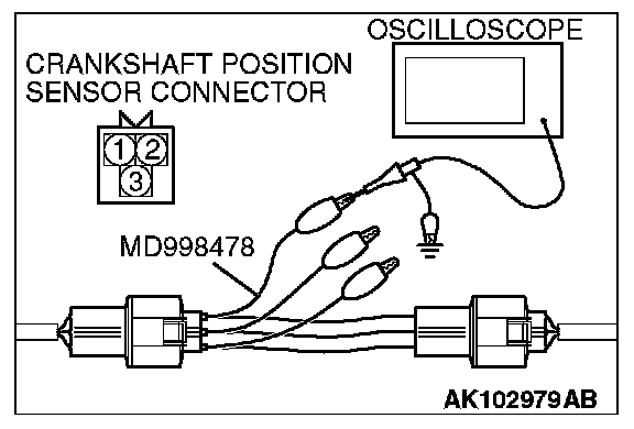 4. Connect the oscilloscope probe to crankshaft position sensor connector terminal No. 2 (black clip of special tool).