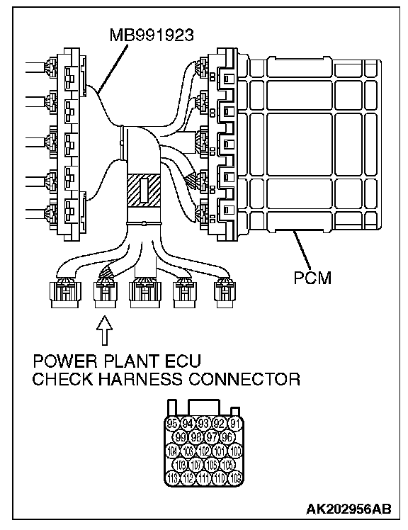1. Disconnect all PCM connectors. Connect the check harness special tool (MB991923) between the separated connectors.