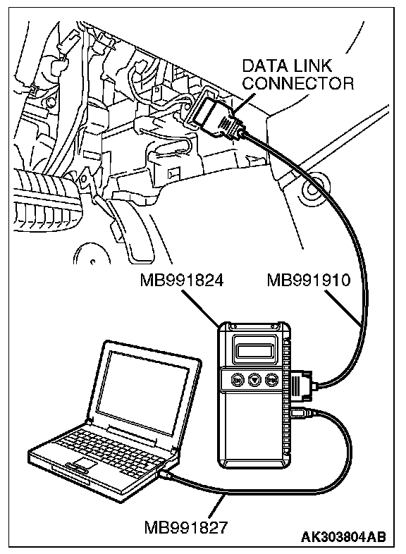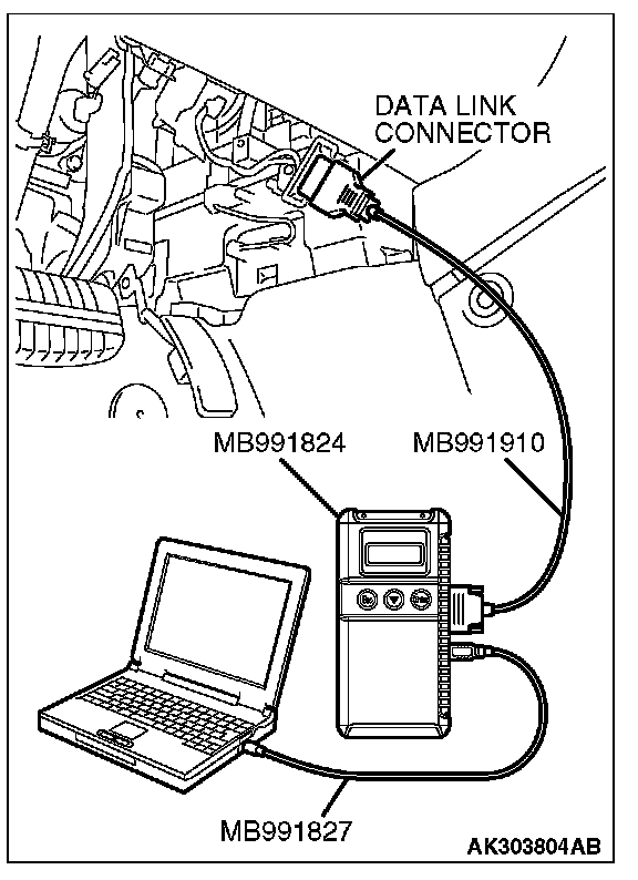 CAUTION: To prevent damage to scan tool MB991958, always turn the ignition switch to the "LOCK" (OFF) position before connecting or disconnecting scan tool MB991958.