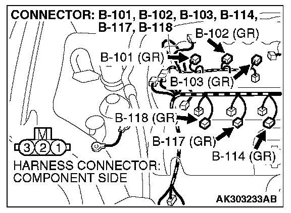 STEP 11. Check harness connector B-01 or B-03 or B-04 at right bank injector for damage.