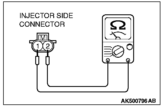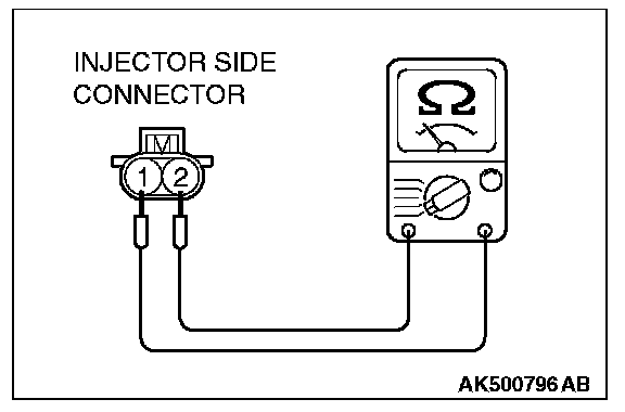 3. Measure the resistance between injector side connector terminal No. 1 and No. 2.