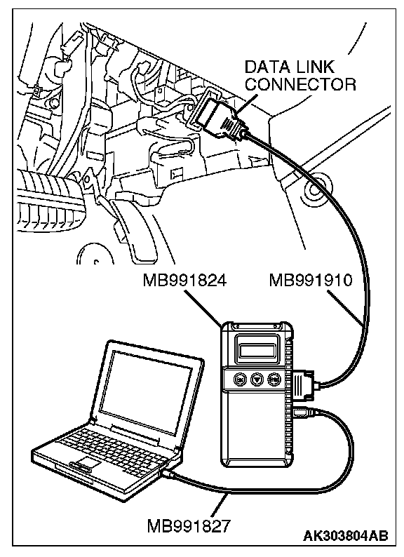 CAUTION: To prevent damage to scan tool MB991958, always turn the ignition switch to the "LOCK" (OFF) position before connecting or disconnecting scan tool MB991958.