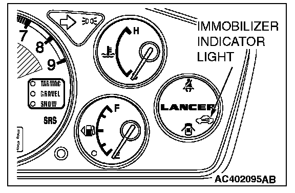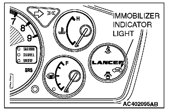 If an attempt is made to start the engine with an unregistered ignition key, cranking occurs, but fuel supply is cut off to disable the engine. In approx. 10 seconds, the immobilizer indicator will blink for approx. 30 seconds.
