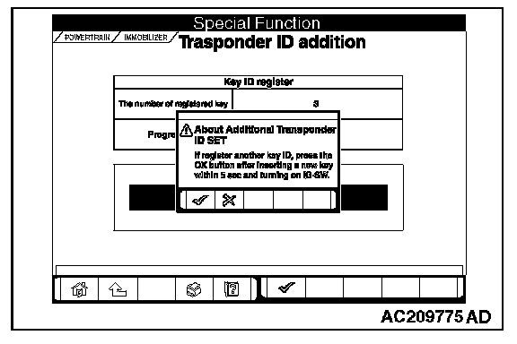 6. If an additional registration is made successfully, the screen will ask if another key is registered or not. If the third ignition key is registered, remove the key, which has been registered. Then insert the third key within five seconds, and then turn it to the ON position.