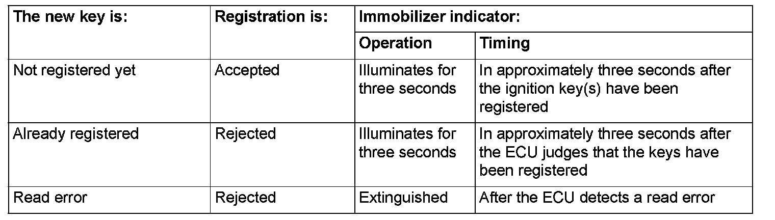 7. The immobilizer-ECU identifies the new key to accept or reject it, and operates the immobilizer indicator (See the table).